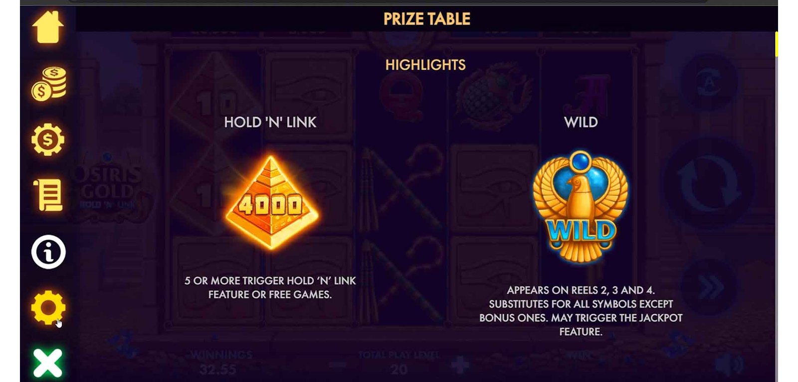 Set against the mystical backdrop of ancient Egypt, Osiris Gold Hold n Link invites players to hold and link symbols to unlock the secrets of the pharaohs. The game's Egyptian theme is brought to life through rich visuals and thematic symbols, providing an immersive experience. Spin the reels to explore the mysteries of Osiris and aim for substantial rewards through the innovative hold and link feature. Osiris Gold combines cultural richness with modern gameplay mechanics, offering players an opportunity to delve into the allure of ancient Egyptian mythology and claim gold rewards along the way.